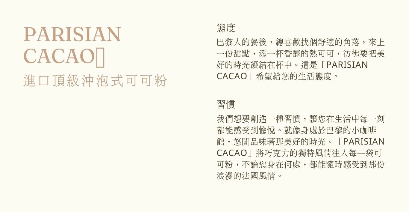 讓「PARISIAN CACAO」成為你生活中的小確幸,讓每一天都有一杯帶有法國浪漫滋味的可可,讓你在忙碌的生活中也能保留一點點浪漫的餘韻。
